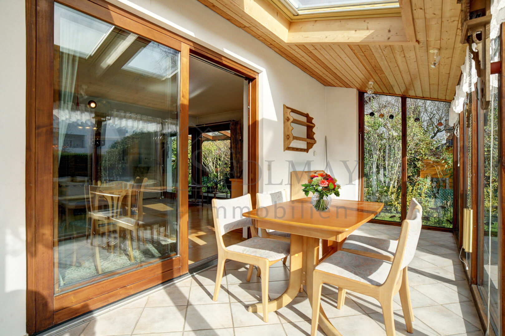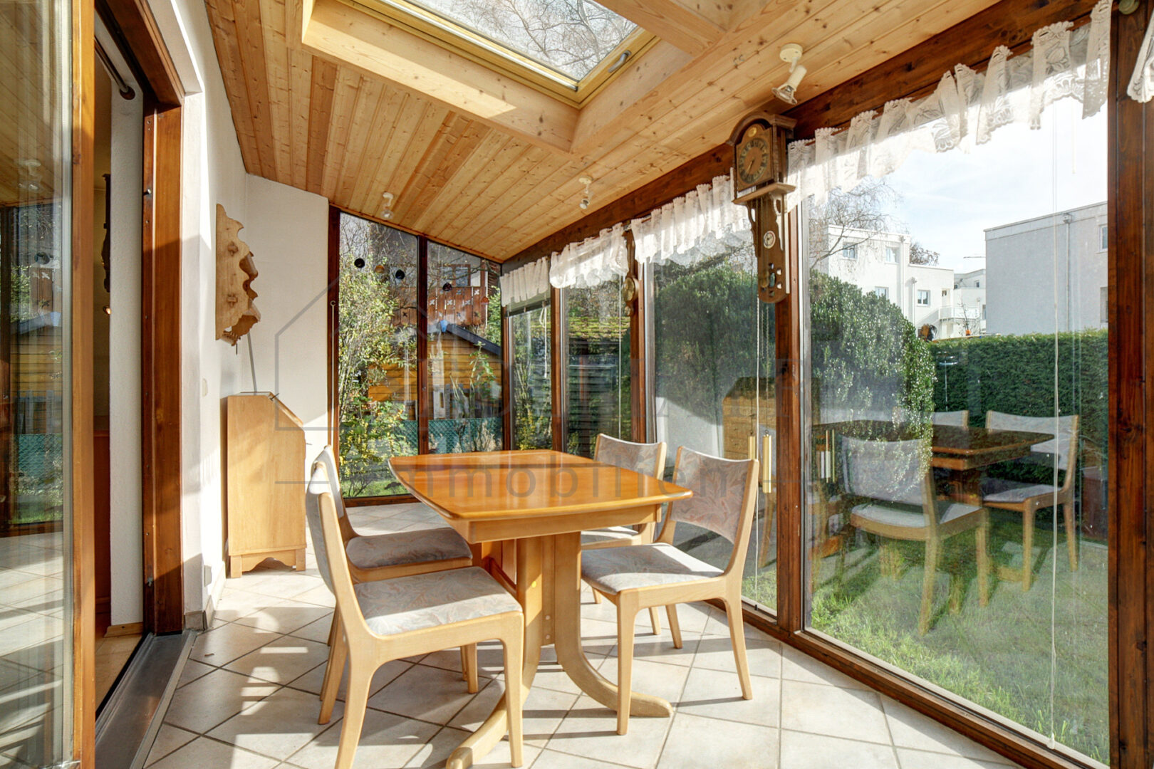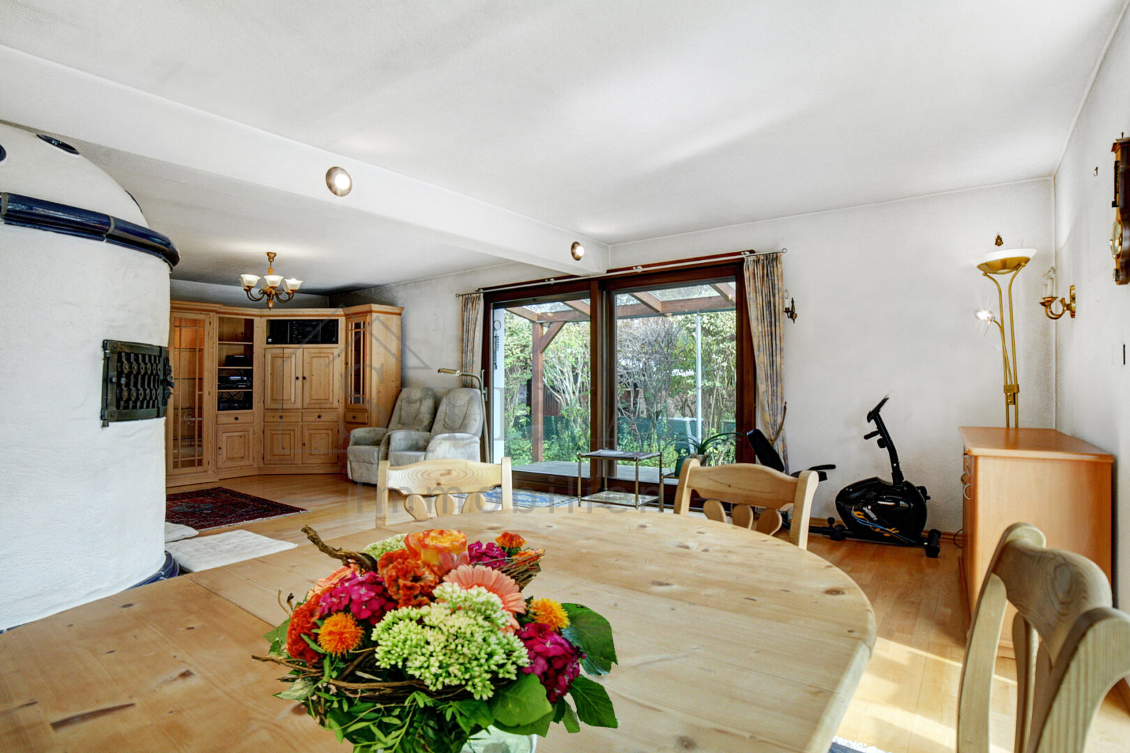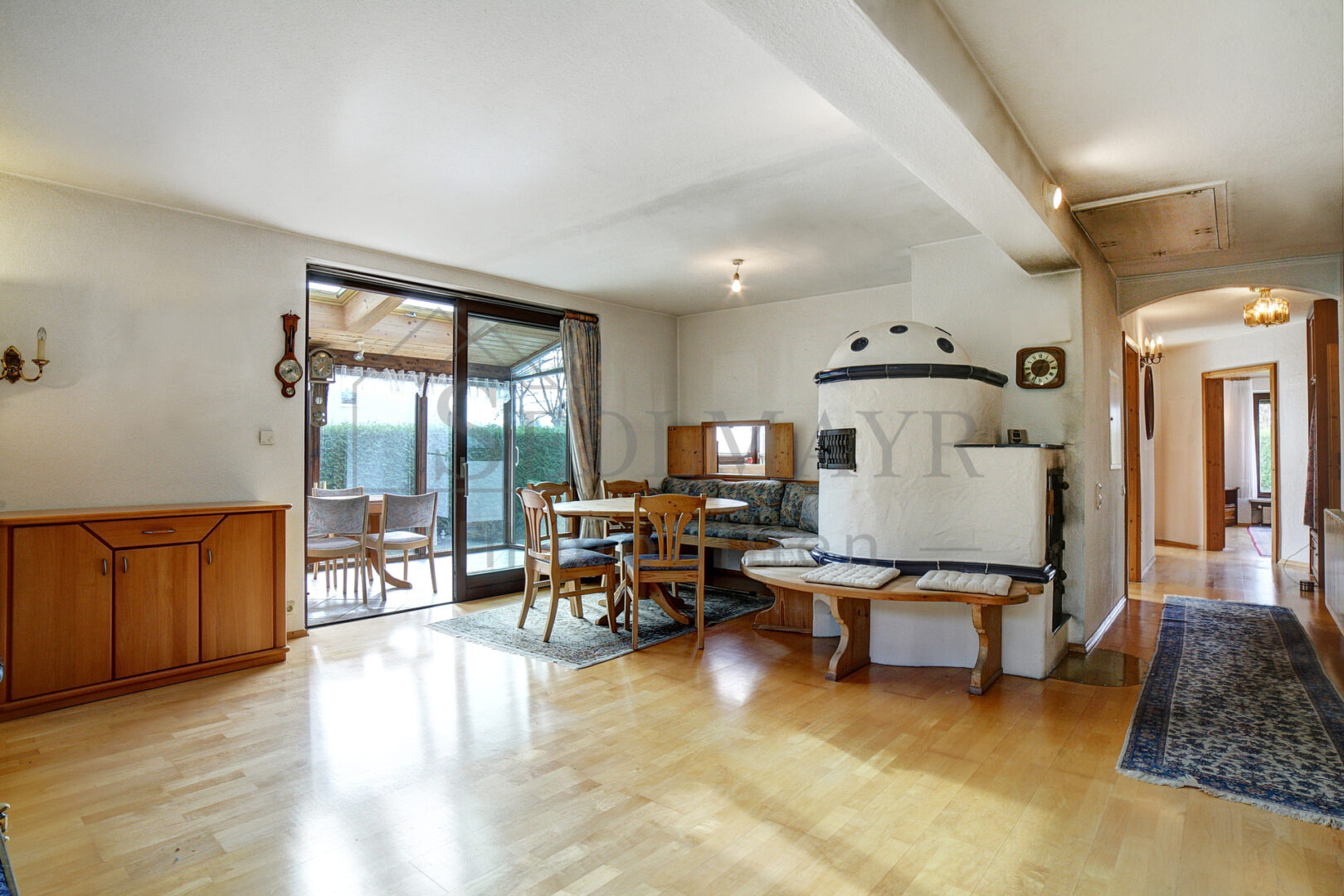 Der großzügige Wohn- und Essbereich ist das Herzstück des Hauses und beeindruckt mit einem wunderschönen Kachelofen, der an kalten Tagen für wohlige Wärme sorgt. Von hier aus gelangen Sie ebenfalls auf die zweite mit Glas überdachte Terrasse mit Garten und in den gemütlichen Wintergarten. Dieser ist rundum mit Glas ausgestattet und sorgt somit für eine helle und freundliche Atmosphäre.