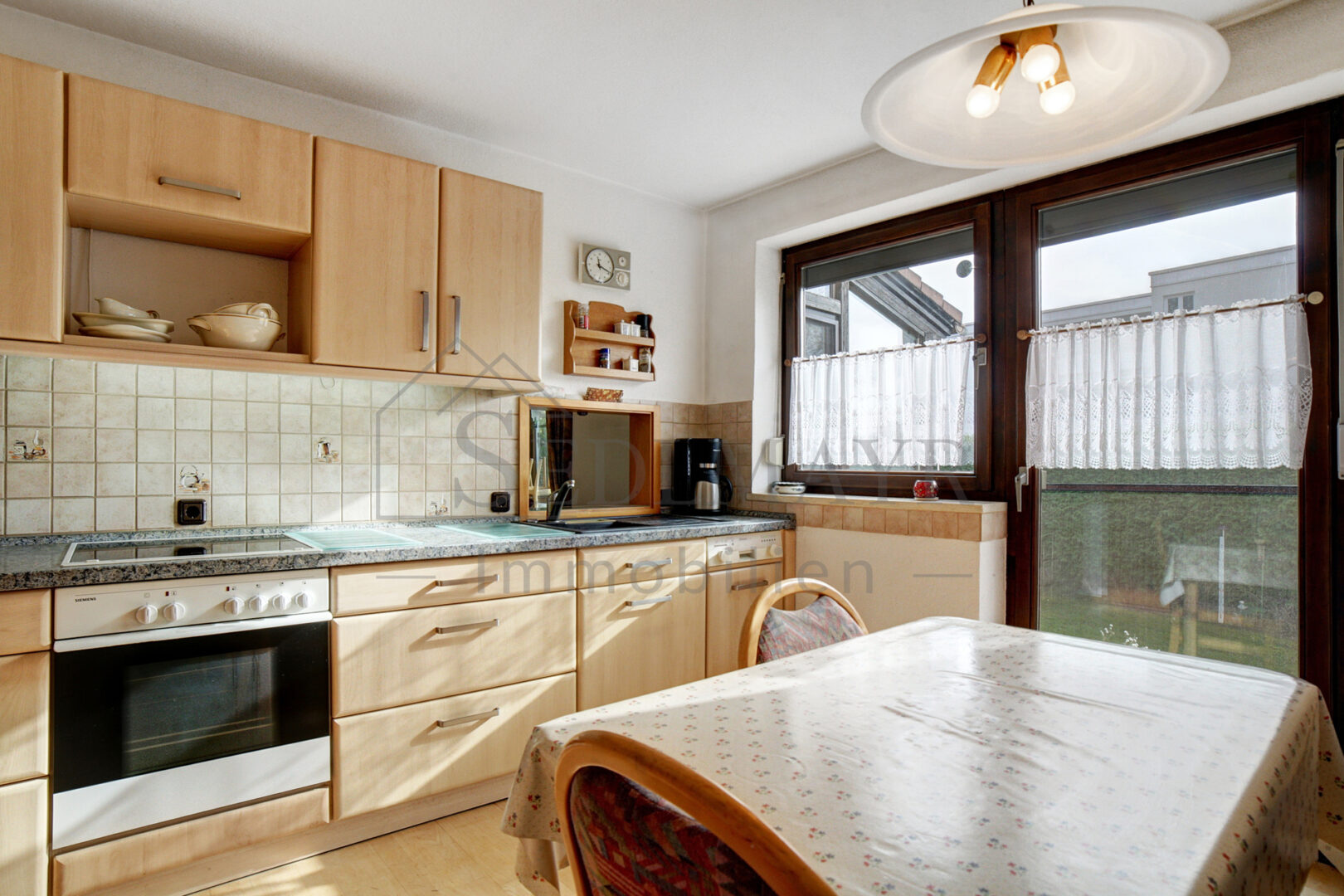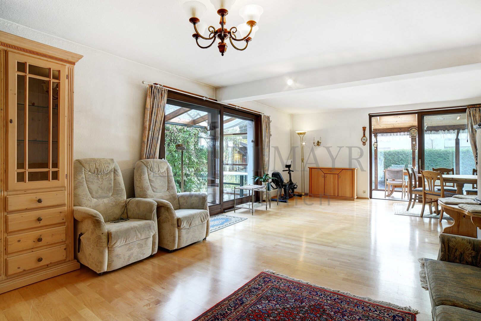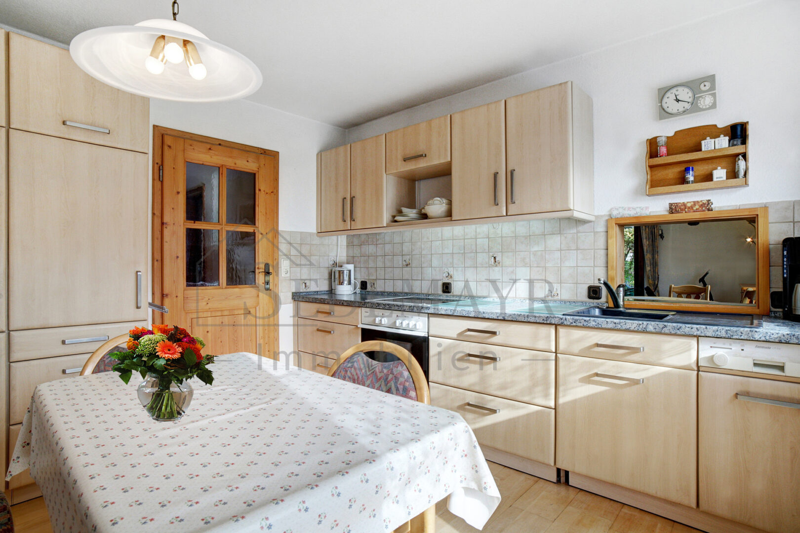 Die helle und freundliche Küche mit Einbauküche bietet praktischen Zugang zu einer der beiden Terrasse, die zum Verweilen im Freien einlädt. Durchgehend wurde hochwertiger Parkettboden verlegt und im Wohn- und Essbereich, sowie im Wintergarten sorgt die Fußbodenheizung für zusätzlichen Komfort.