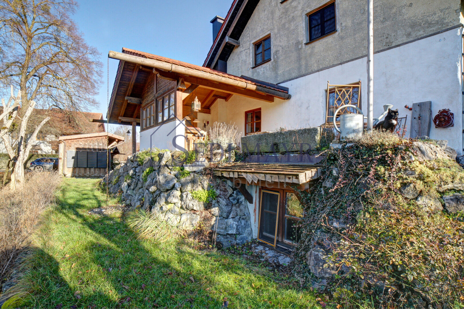 Auch der Außenbereich ist liebevoll gestaltet. Ein großzügiger Freisitz mit offenem Kamin lädt zu geselligen Stunden ein. Eine Zisterne zur Regenwassernutzung, eine PV-Anlage sowie Solarthermie ergänzen das nachhaltige Gesamtkonzept. Für Fahrzeuge stehen eine große Garage und ein Carport zur Verfügung. Über beiden befindet sich zusätzlicher Stauraum, der über eine Außentreppe erreichbar ist.